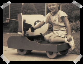 This was me during WWII. My Dad was a B-17 pilot and I was practicing to be his tail gunner. That didn’t work out…but I had fun trying. Please note the all-wood construction. During the war metal was needed for things like guns, tanks, planes, ships, et cetera. Toys were mostly made of wood.